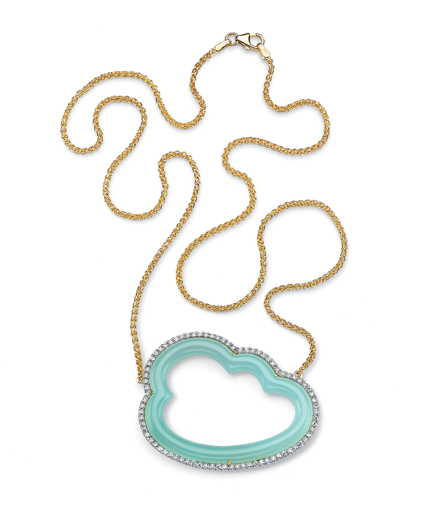 Pamela Huizenga’s new Silver Lining necklace, featuring a blue chalcedony cloud with a diamond frame in 18-karat gold, has such a warm feel to it.