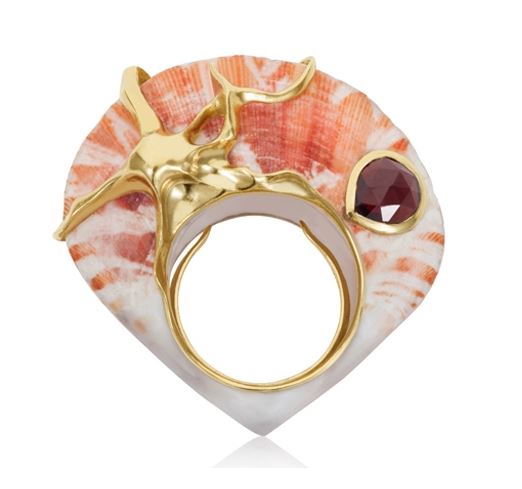 Shagreen Et Tortoise is a brand I recently discovered, and immediately fell in love with, on Instagram. The brand offers a line of shell rings set in a vintage-inspired style. This Gypsum Octopus Ring is crafted from a natural pecten vexillum shell and finished in 18-karat gold vermeil, with a rhodolite garnet accent.