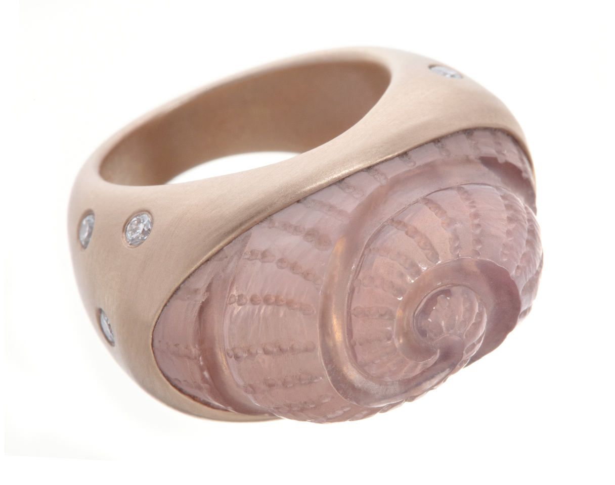The one-of-a-kind “She Sells Seashells” ring from Wendy Brandes, featuring a hand-carved rose quartz and diamonds in 18-karat rose gold, is delicate enough to be wearable on many occasions while still giving off a unique, summery vibe.
