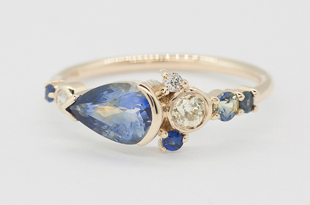 The pieces often use antique diamonds and rare stones, such as bicolor sapphires, with minimal metalwork to let them shine.