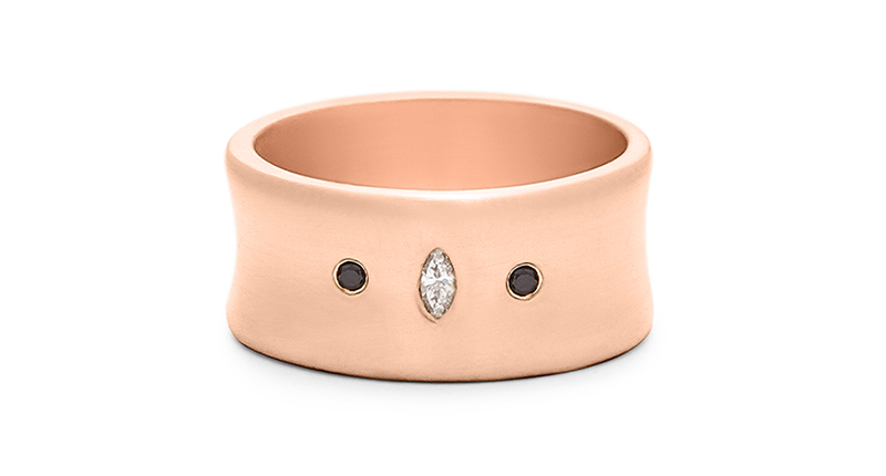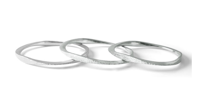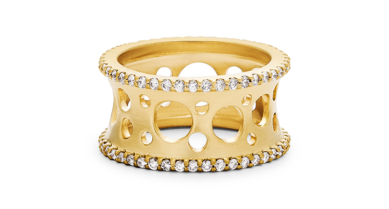 DB: I am a bench jeweler by trade and metalsmith. My pieces highlight the beauty of pure precious metal and the true art of traditional jewelry craftsmanship infused with a modern aesthetic. The silhouettes are unexpected, and I always add a hidden detail such as movement in my riveted collections, a gallery of hidden cutouts on rings, a tiny diamond’s sparkle on an everyday stacking ring or an asymmetrical shape. With matte and hammered finishes, they are understated enough to wear every day, and I want to inspire people to wear “real” jewelry every day. I also encourage the wearers
