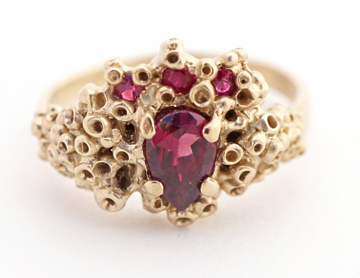 The 14-karat yellow gold “Crown” ring, set with rubies and a pear-shaped faceted rhodolite ($1,160)