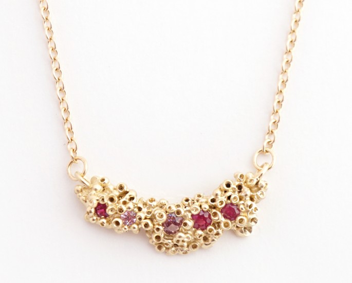 The “Keter” necklace is made in 14-karat yellow gold with pink sapphires and rubies ($1,320).