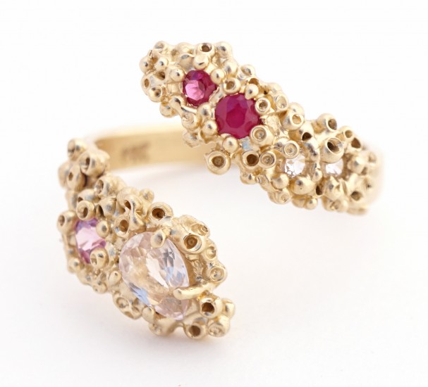 The Keter gold ring, made in 14-karat yellow gold, is set with pink and white sapphires, rubies and a pear-shaped faceted morganite ($1,680).