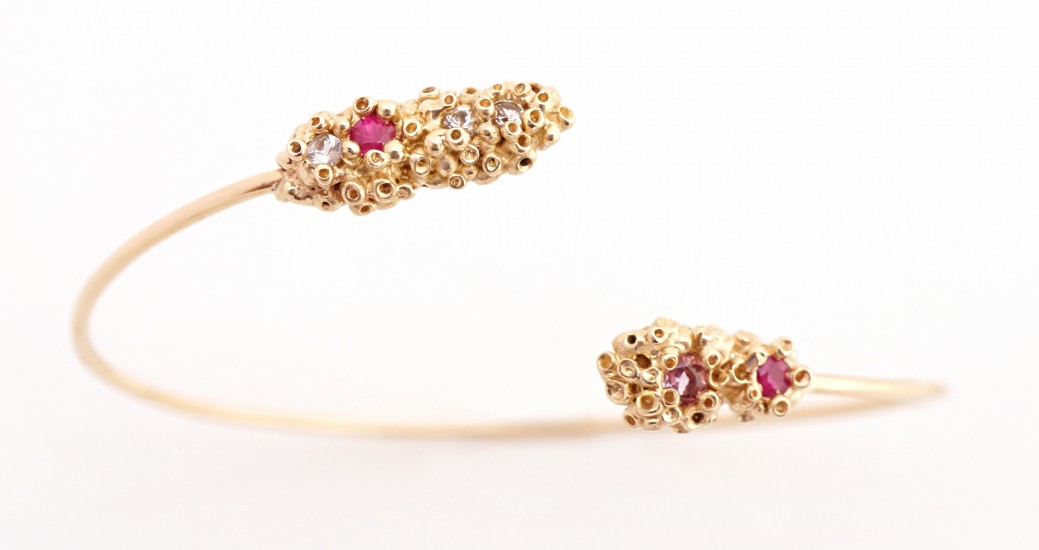 The Keter gold cuff, in 14-karat yellow gold with white and pink sapphires and rubies ($1,280)