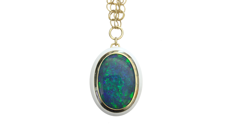 This Monica Rich Kosann locket pendant is 18-karat yellow gold with black opal framed by a cachalong opal border. It will retail for more than $200,000.