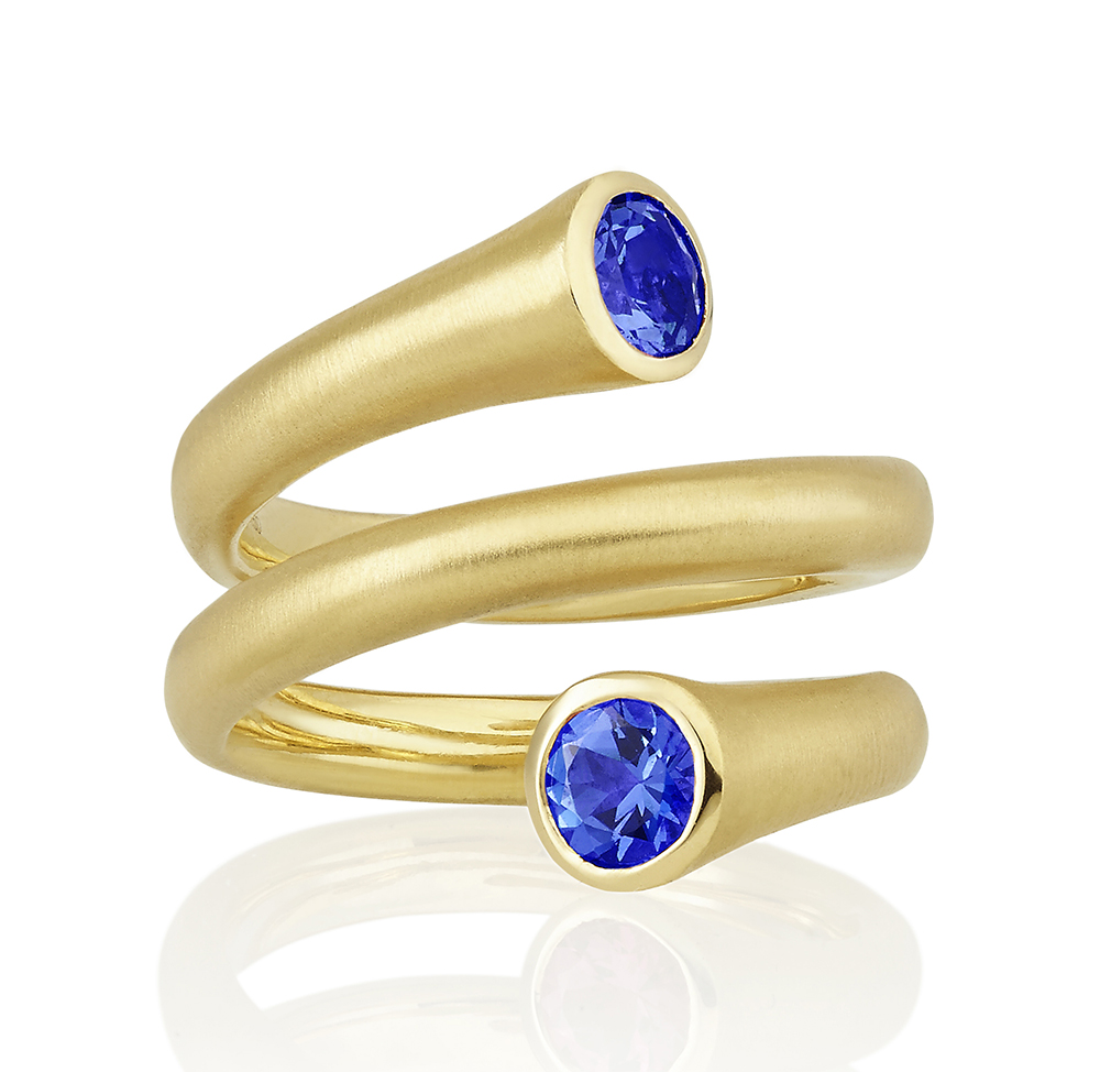 Carelle’s “Whirl” sapphire spiral ring made in 18-karat yellow gold ($3,250)
