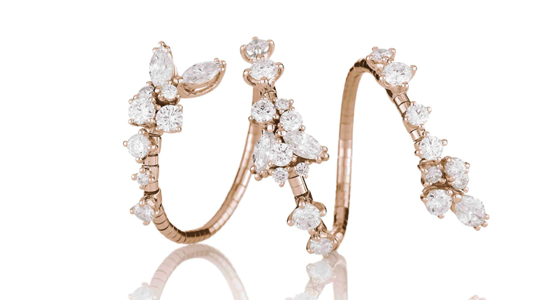 Kaplan Gross cites her “Diamond Ivy” double-finger ring as her favorite piece of the moment. It features a multitude of fancy-cut white diamonds set in 18-karat white gold.