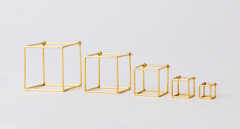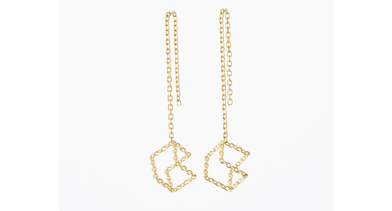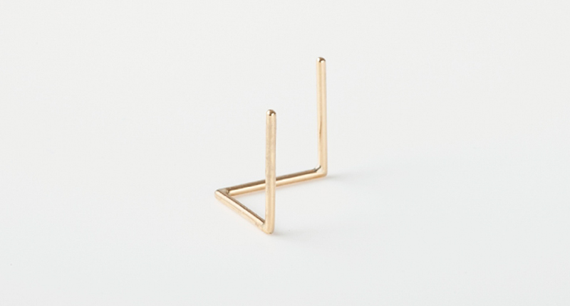 Ishihara’s 3-D square and triangle earrings, from one of his first collections, which have become a sort of signature, utilize one edge of the earring’s structure as its closure, going through the ear and connecting to the rest of the design seamlessly, without any wasted space to accommodate for an earring back.