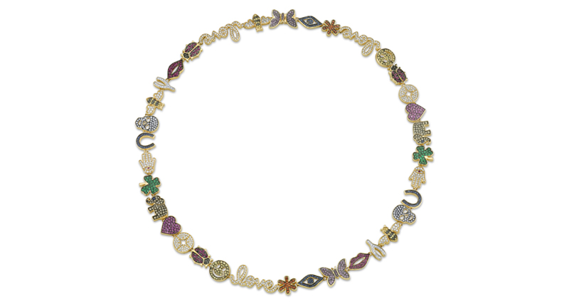 The pièce de résistance is the maximalist necklace that combines all of these symbols, which is available in white gold with diamonds, yellow gold with diamonds or a multi-colored gemstone version. There is also a bracelet version.