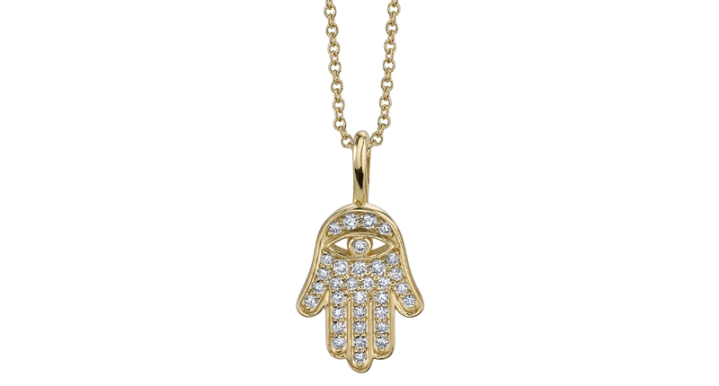 The collection features wishbone, horseshoe, hamsa and evil eye pendants, plus Karmes’ “love” script necklace, all rendered in 14-karat gold with white diamonds.