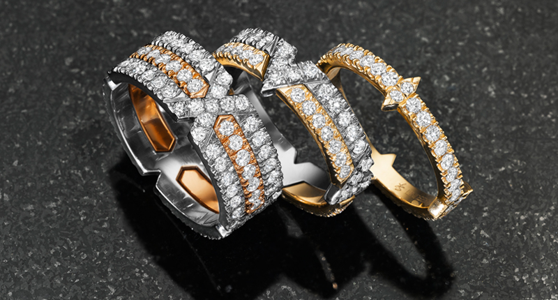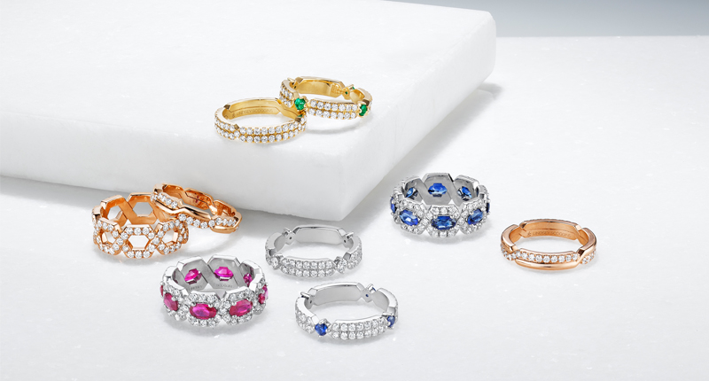 The most modern and elegant of the bunch is the “Still” collection, in which the designer livens up a classic eternity band by rendering it in a hexagonal shape. The concept is simple, but upends the average eternity style while still holding an appeal for a wide range of women.