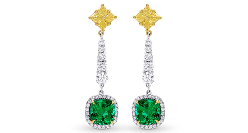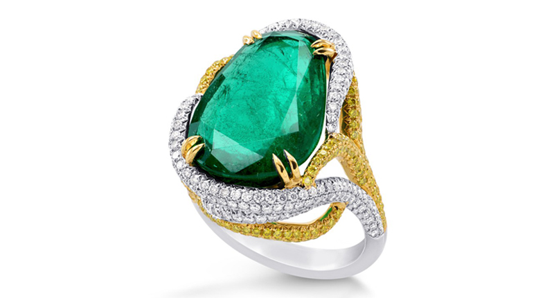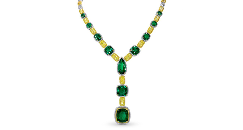 There currently are four pieces listed as available in the collection, and together they are priced at a total of about $1.1 million retail. Highlights include a 64.65-carat emerald and yellow diamond necklace and a 24.23-carat cushion-shaped emerald and vivid yellow diamond ring.
