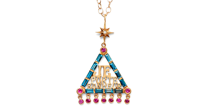 There are pendants and earrings in vivid, unexpected color combinations of pink and blue, or pink and orange, reminiscent of India, heavy medallions that bring to mind baptismal medals, and French wording throughout that is etched across rings and sturdy metal cuffs.