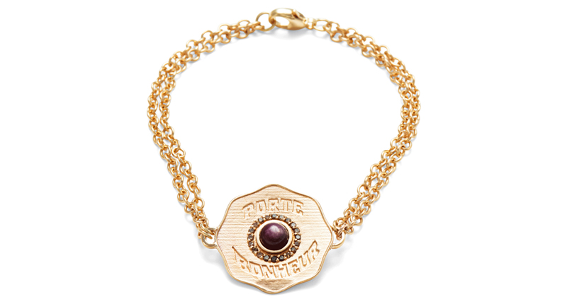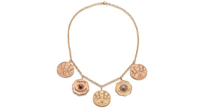 The brand’s various medallions are inspired by coins Lazowski has picked up on her travels, and her versions of them function as good luck charms.