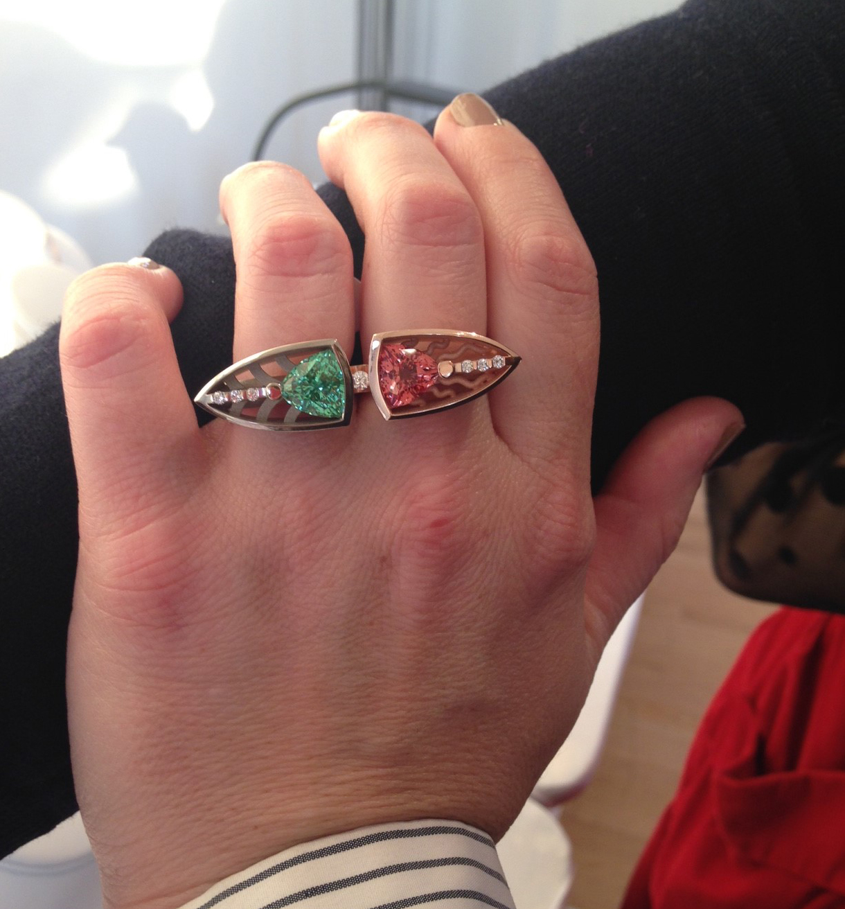 Patrick King of Jewelsmith created this double-finger ring, which I think is the perfect combination of being trendy and being subtle. Made in 14-karat rose and white gold, the two-finger features a 2.10-carat trillion sunstone and a 2.90-carat trillion tourmaline accented with diamonds.