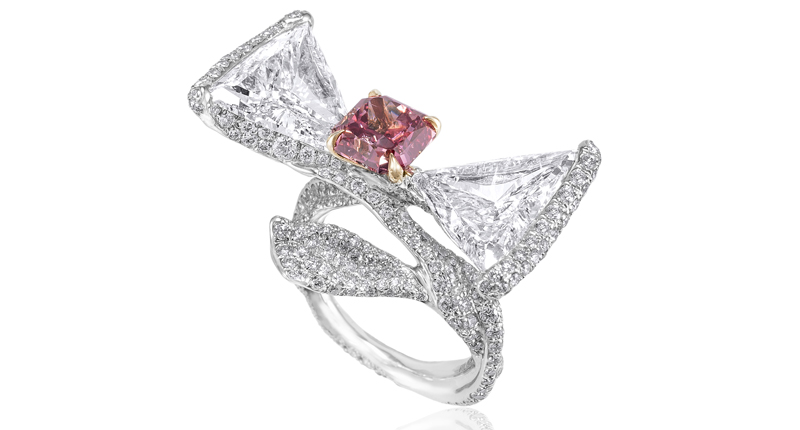 The ring featured an exquisite 1.51-carat cut-cornered square fancy purplish-red diamond set in 18-karat white gold with an array of white diamonds, all set in 18-karat white gold.