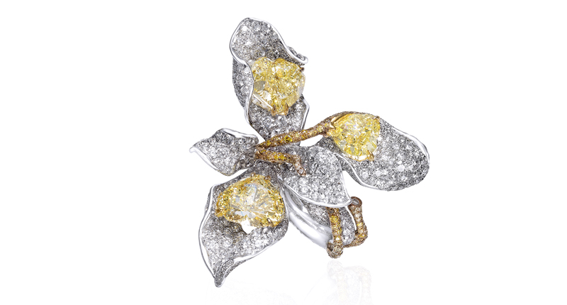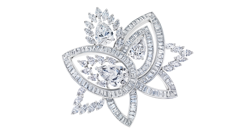 The water flower gave De Beers plenty of inspiration, whether translated into a cornucopia of white diamonds arranged like “petals” open to the sunlight in brooch form, or as a mix of rough, natural color diamonds set against their cut, white diamond counterparts in styles meant to represent the flower as seen in a mix of shadow and light at various times of the day.