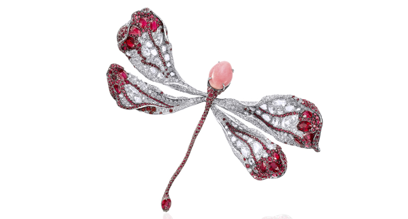 Cindy Chao showed pieces representing themes central to her career, flora and fauna, displaying her particular affinity for dragonflies, but also making a departure with the No. X Red Diamond Ribbon Ring, new for 2017.