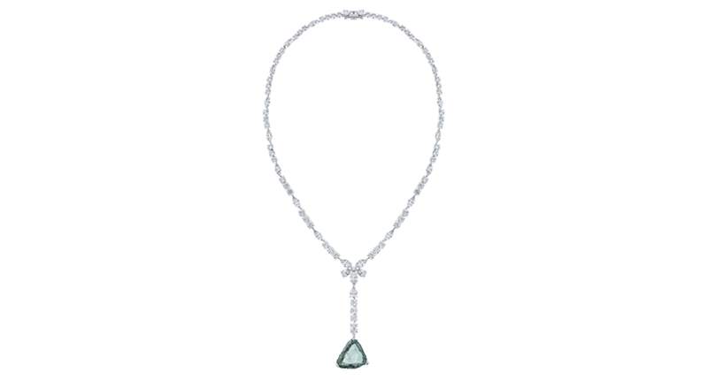 De Beers debuted its Lotus collection, of which a rough macle diamond-- a flat, triangular twinned-crystal diamond--was the star, juxtaposed with the diamond company’s more traditional, polished stones on a long necklace.
