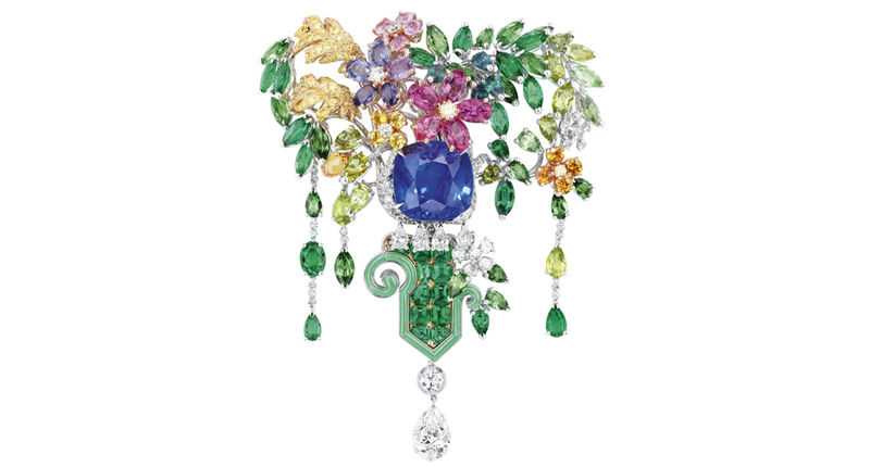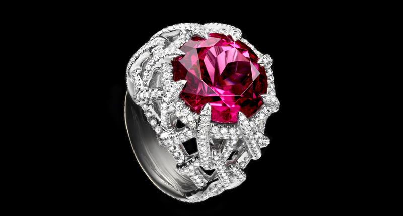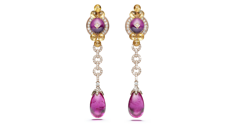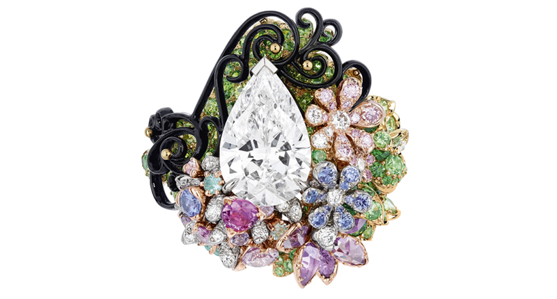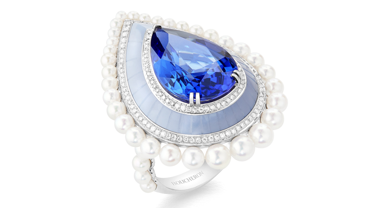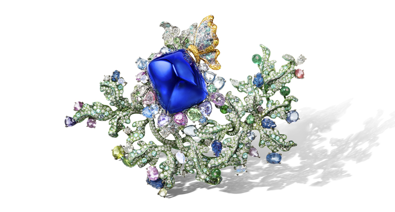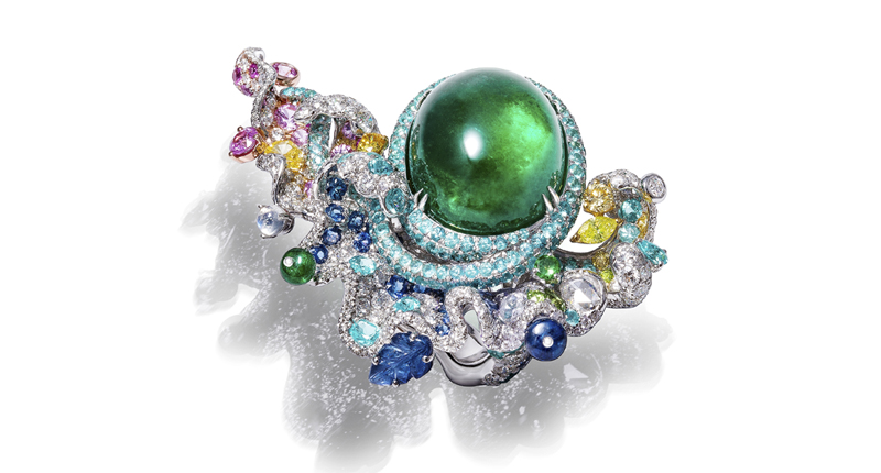 In Paris, the designer showed elaborate designs that often were anchored around one prominent gemstone, such as a sugarloaf tanzanite or cabochon emerald.