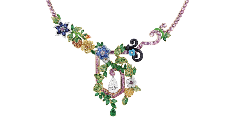 Spectacular gemstone color combinations lent the collection a vibrant palette and contagious whimsy, which was all the more striking when combined with the pieces’ strong geometric lines, meant to reference the gardens’ bold landscaping.