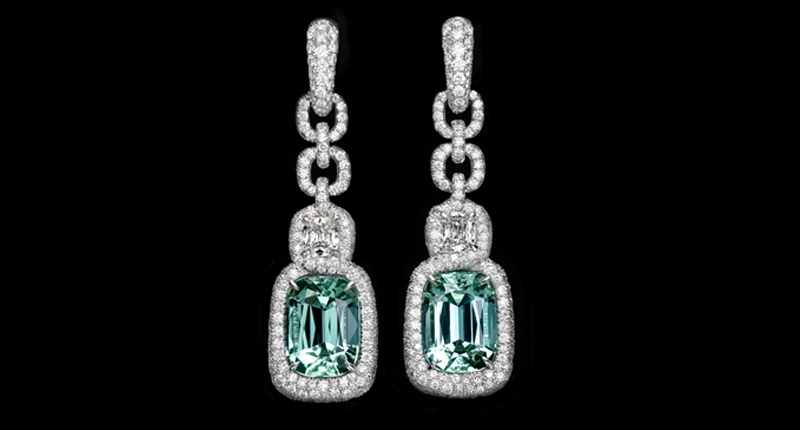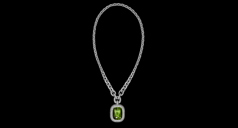 David Yurman took a more wearable approach to color, setting large colored gemstones like rubellite and peridot against a background of neutral white diamonds and white gold or platinum. Much of the interest in the pieces was in the bold, architectural designs of the settings.