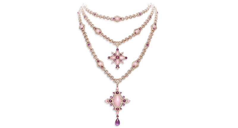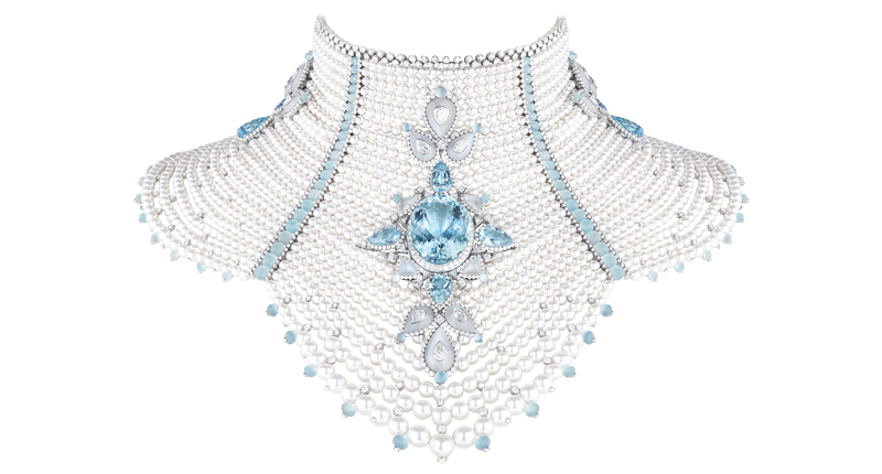 White gold, diamonds, mother-of-pearl and rock crystal formed ice and snowflakes, while accents of pearl, aquamarine and tanzanite further enhanced the collection’s romantic, wintry feel.