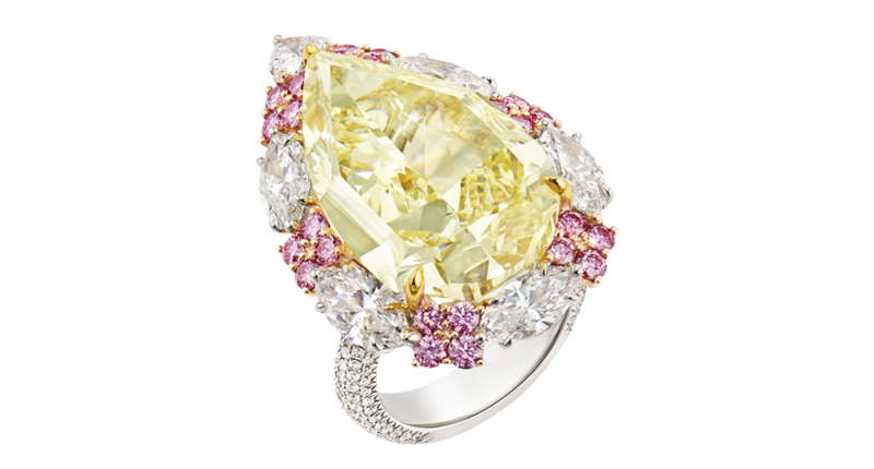 On display were suites featuring the exquisite gemstones Modi is known for employing in his work, as well as some of his patented diamond cuts. A 20.87-carat pear-shaped fancy yellow diamond ring was not to be missed.