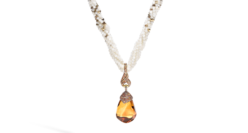 The tagua nut locket is carved to depict Naga, the mythical dragon featured in many John Hardy designs, and embedded with a citrine and blue sapphire. Inside the locket rests a Madeira citrine hung from a mother of pearl, yellow gold and andalusite bead necklace. The entire design is adorned with brown diamond and orange sapphire pave.
