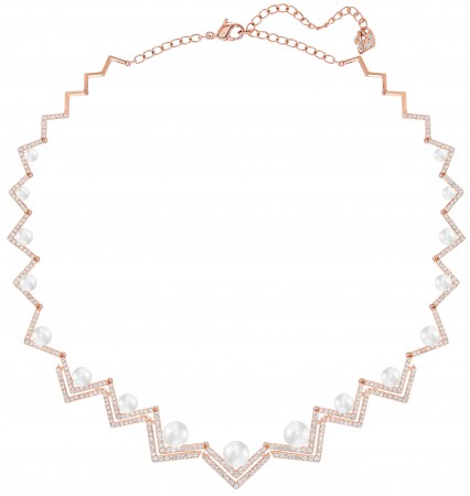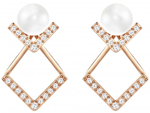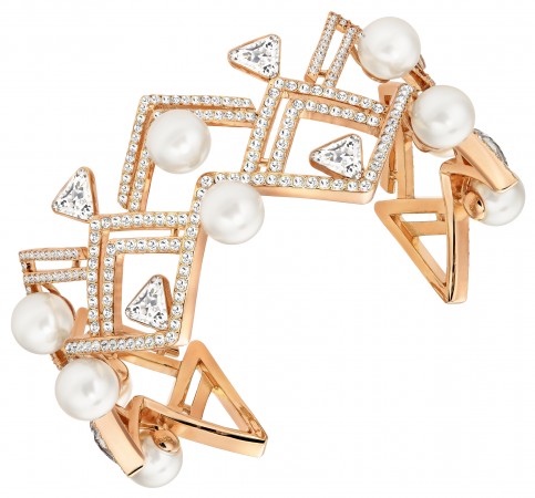 The glamorous “Edify” necklace, also in a rose-gold plated metal with Swarovski’s crystal pearls ($299). The matching Edify cuff also has the V-shaped structure of the necklace and is made with the same materials with the addition of clear crystal pavé ($125).