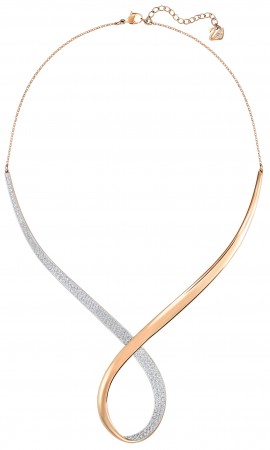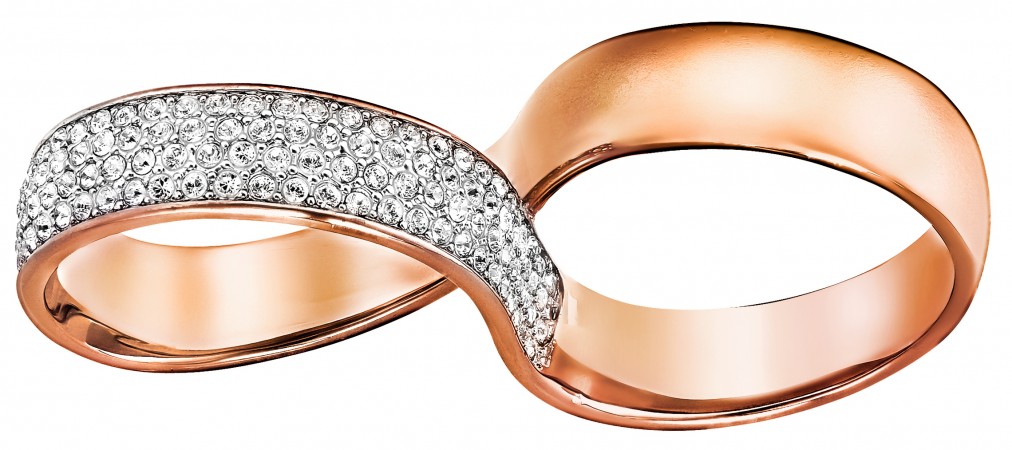 The Exist necklace, which features a ribbon design in a rose-gold plated base metal with clear crystal pavé ($169) and goes with the Exist double-ring, also made in a rose-gold plated base metal with clear crystal pavé ($149)