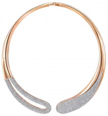 The “Torque” necklace is a true statement piece in a rose-gold plated metal with clear crystal pavé. The organically-shaped piece is made with a spring-hinge closure mechanism ($249).
