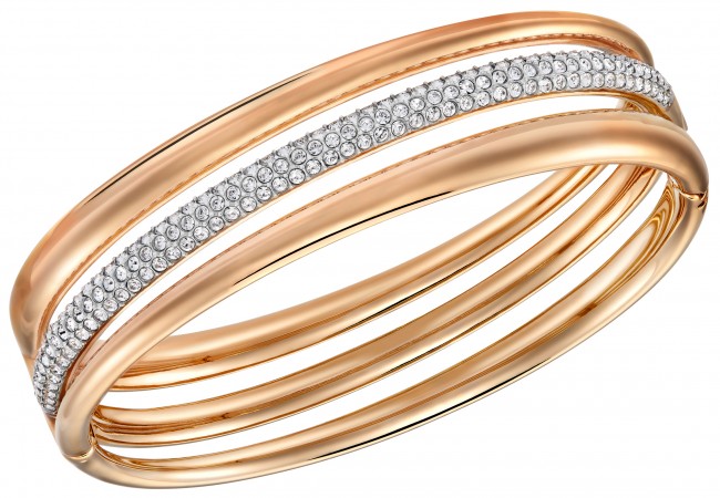 The “Exact” bangle, available in multiple sizes, offers a fluid silhouette in a rose-gold plated metal with clear crystal pavé ($169).
