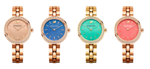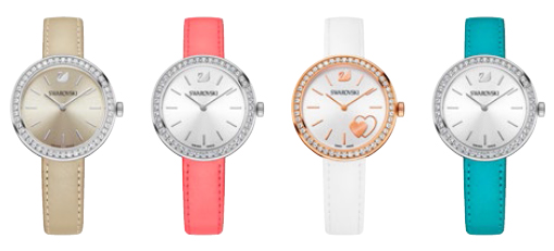Swarovski’s “Daytime” watches, made with a stainless steel case set with 48 clear crystals on the bezel, a 34 mm dial, index markers and the Swarovski swan logo at 12 o’ clock. These timepieces feature a Swiss quartz movement and come in a variety of colors ($249 to $299).