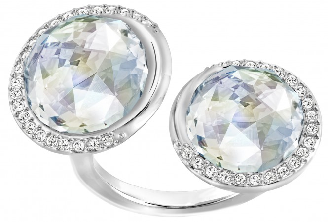 The “Except” double ring offers an open-shank silhouette in a rhodium-plated metal with “Light Azore Moonlight” crystals and crystal pavé ($149).
