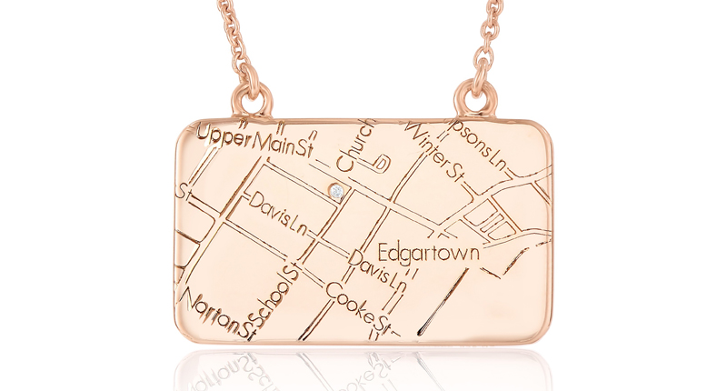 Maps by A. Jaffe continues to come up with new versions of their clever original design, in which a diamond marks a special spot on a map customized to a location of a customer’s choosing. An understated, rectangular style feels appropriate for all ages and the back of the pendant can be engraved for an extra layer of personalization.