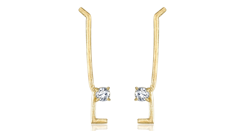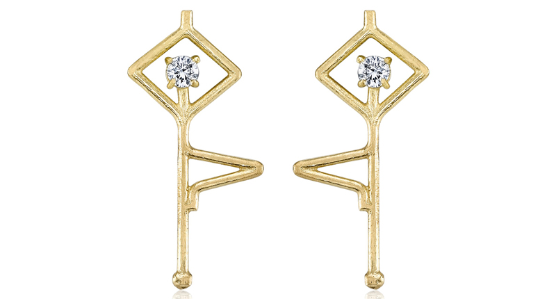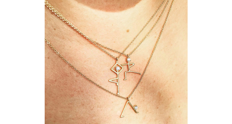 Mars + Love's stick figures are depicted in classic yoga poses like “tree” and “downward dog,” and rendered in 18-karat gold with diamond accents. Meant to be worn as everyday pieces, the collection comprises stud earrings, pendant necklaces and rings.