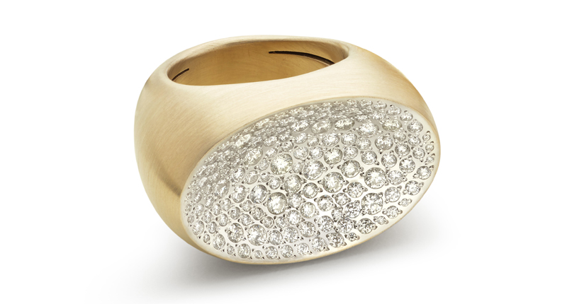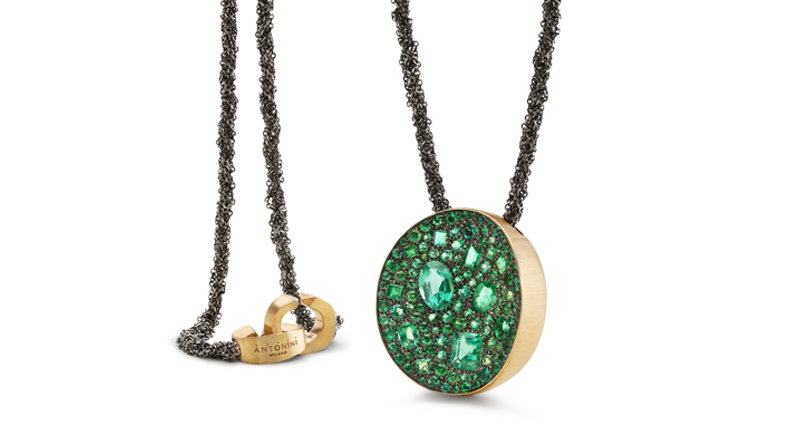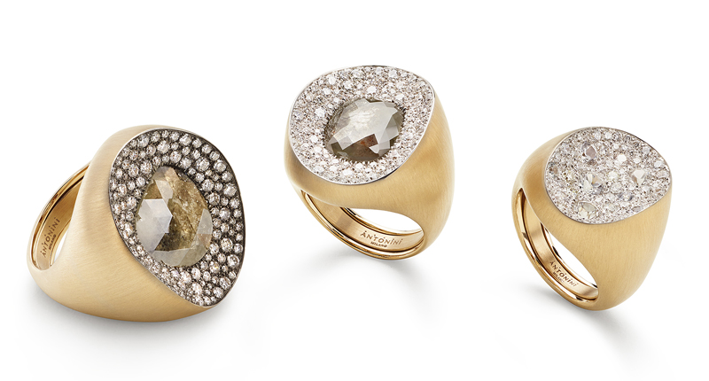 In the collection this year, Antonini upped its new Etna offerings with a series of “Mosaic” pendants and rings, similar to Etna styles but pave-set with clusters of different-sized diamonds and gemstones.