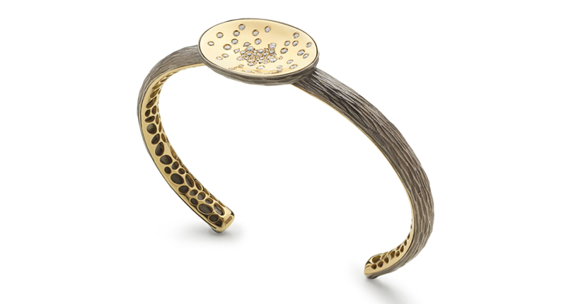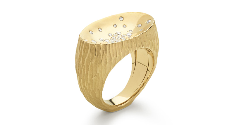 This natural inspiration was translated into jewelry through organic, roughly textured ring shanks and bracelets, their surfaces appearing like volcanic rock.