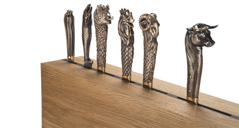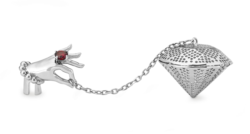 In addition to jewelry, Webster is also selling some of his classic home décor items, which display the designer’s sense of irreverence and fun. They include a set of luxurious kitchen knives with handles depicting animals, a vape pipe, and even a tea strainer. Prices start at $40 for a coffee mug.