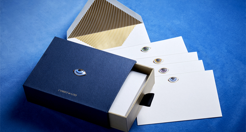 L’Objet + Lito stays true to Lito’s evil eye creations, adapting them to porcelain plates, book ends, a tray, refillable candles, a letter opener, stationary, a magnifying glass box that would be a natural fit for jewelry and a large paper weight.