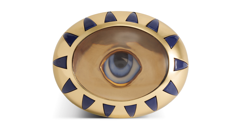 Karakostanoglou, who has a store in Athens and has been designing for 10 years, originally was hesitant to create an evil eye motif due to its ubiquity. She changed her mind when she met an artist in Russia who creates the enamel eyes of saints that adorn Orthodox churches.