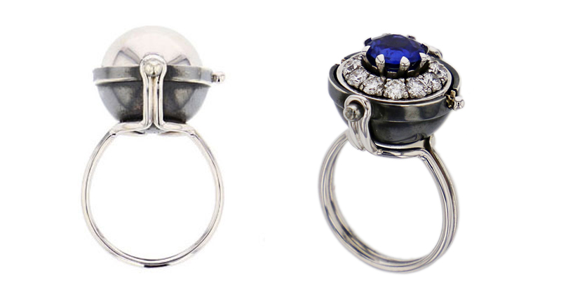 Take the “Sirius Ring,” crafted in 18-karat white gold and silver, which features a striking round brilliant sapphire surrounded by white diamonds. The ring can be closed to cover the precious stones, easily transitioning the piece from day to night, luxurious to demure.