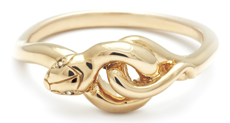 The collection also represents one of the designer’s most accessibly priced; a sterling silver and champagne diamond Serpent band starts at $450 and the majority of the offerings in 14-karat gold and diamonds fall at $1,500 or below.
