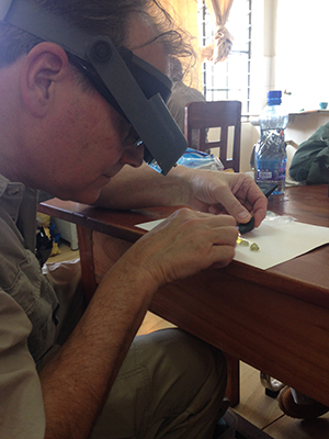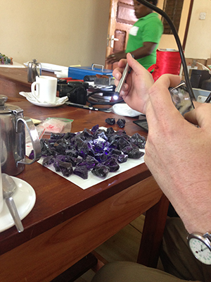 Here’s gemstone cutter Roger Dery evaluating some of the rough stones we saw in Voi, Kenya.