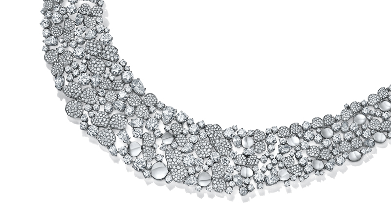 Representing the upper end of the spectrum is the high jewelry assortment, the hero piece of which is an ornate bib necklace featuring more than 68 carats of pear-shaped and round brilliant white diamonds, interspersed among platinum flowers.