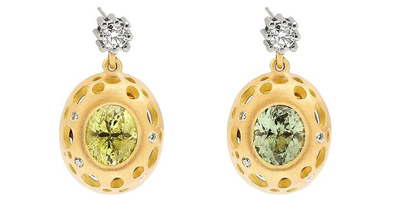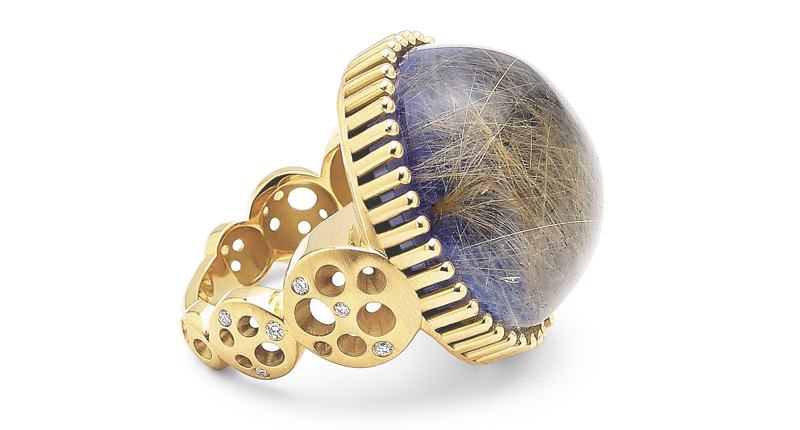 “I was attracted by the uniqueness of specific coloration and patterns,” Bronfman explained. “I hand-selected stones such as chrysoberyl, lapis lazuli and rutilated quartz doublets, emeralds, natural colored diamonds, malachite, turquoise and chrysocolla, which all inspired me to design pieces with dimension and hidden details.”