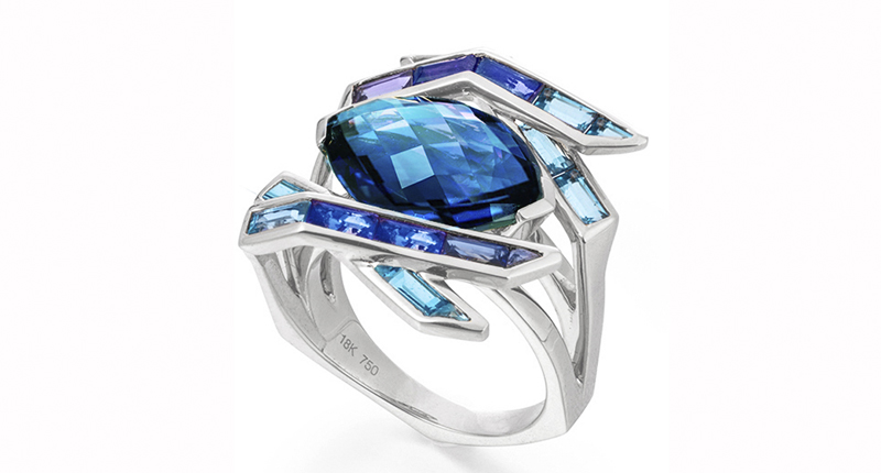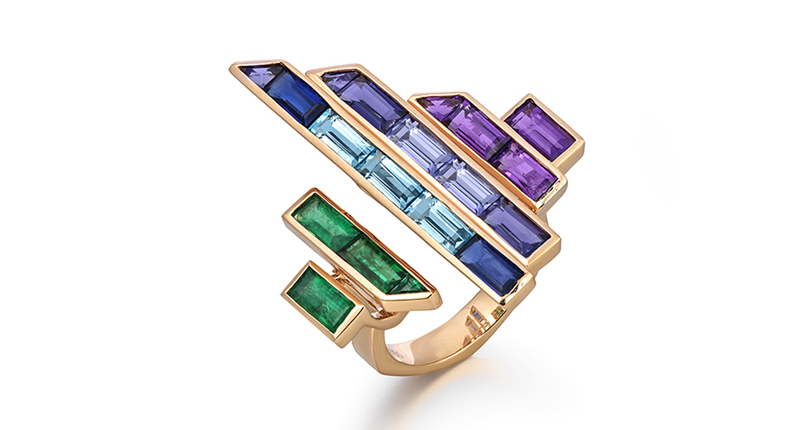 The former employs baguette colored gemstones like emeralds, sapphires, iolites, topaz and amethyst set in angular, futuristic shapes that take their inspiration from the film “Blade Runner,” mixed with a touch of geometric Art Deco influence.