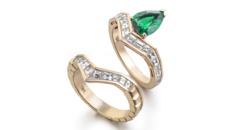 This “Electric Night” emerald engagement ring set is one of them.